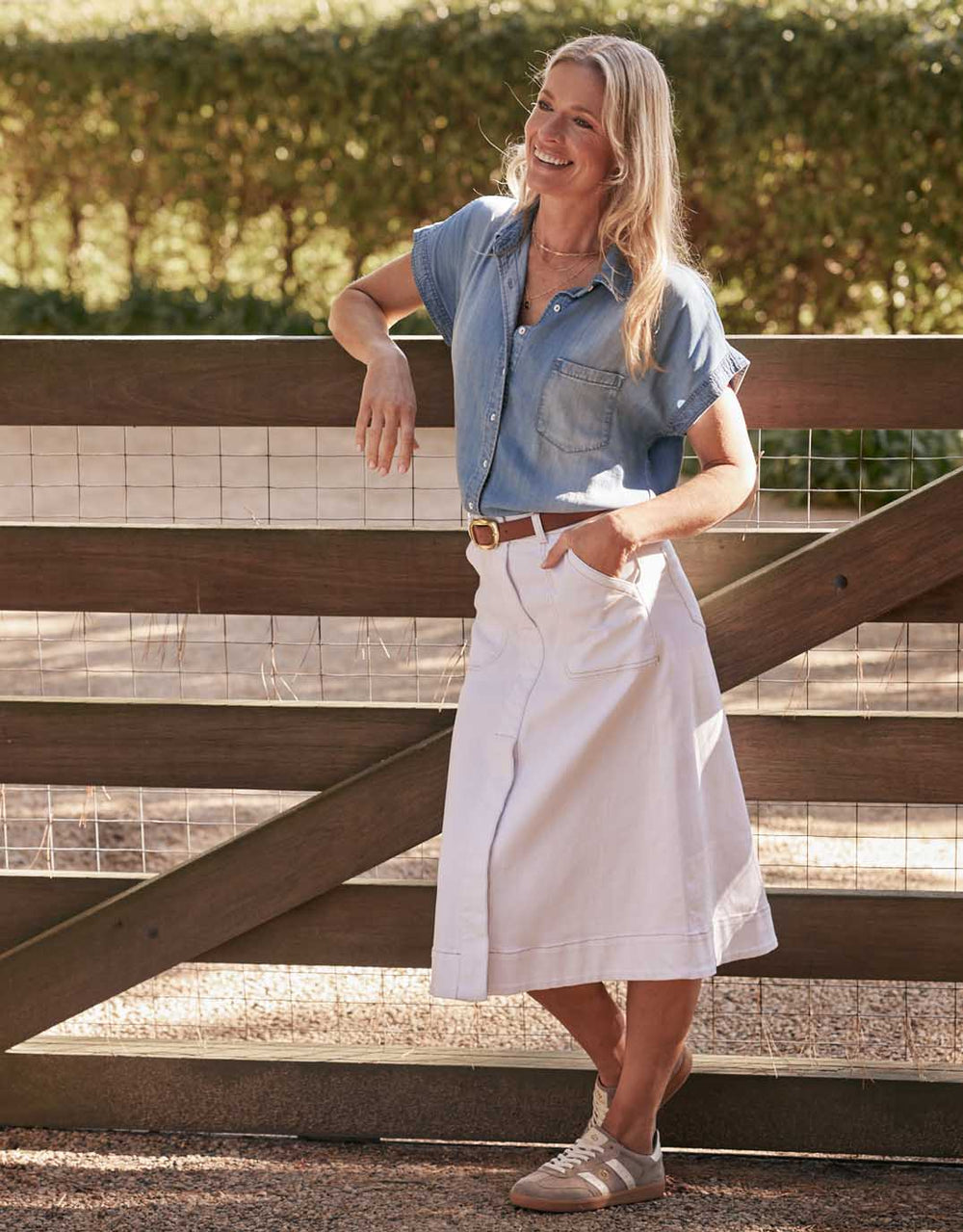 A denim skirt is one of those forever pieces that always earns its place in your wardrobe. Versatile and easy to wear, it can be dressed up or down depending on the day. Pair a mid-length denim skirt with a crisp white linen shirt and slides for a relaxed summer look, or team a darker wash with a tucked-in tee and trainers for easy weekend dressing. For the office, add a smart cotton blouse and loafers, or try layering with a lightweight knit and denim jacket for cooler evenings.