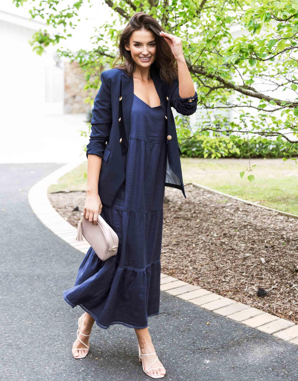 - Our classic stripe tee tucked into the patio stripe midi linen dress creates a relaxed, Hamptons-inspired style.